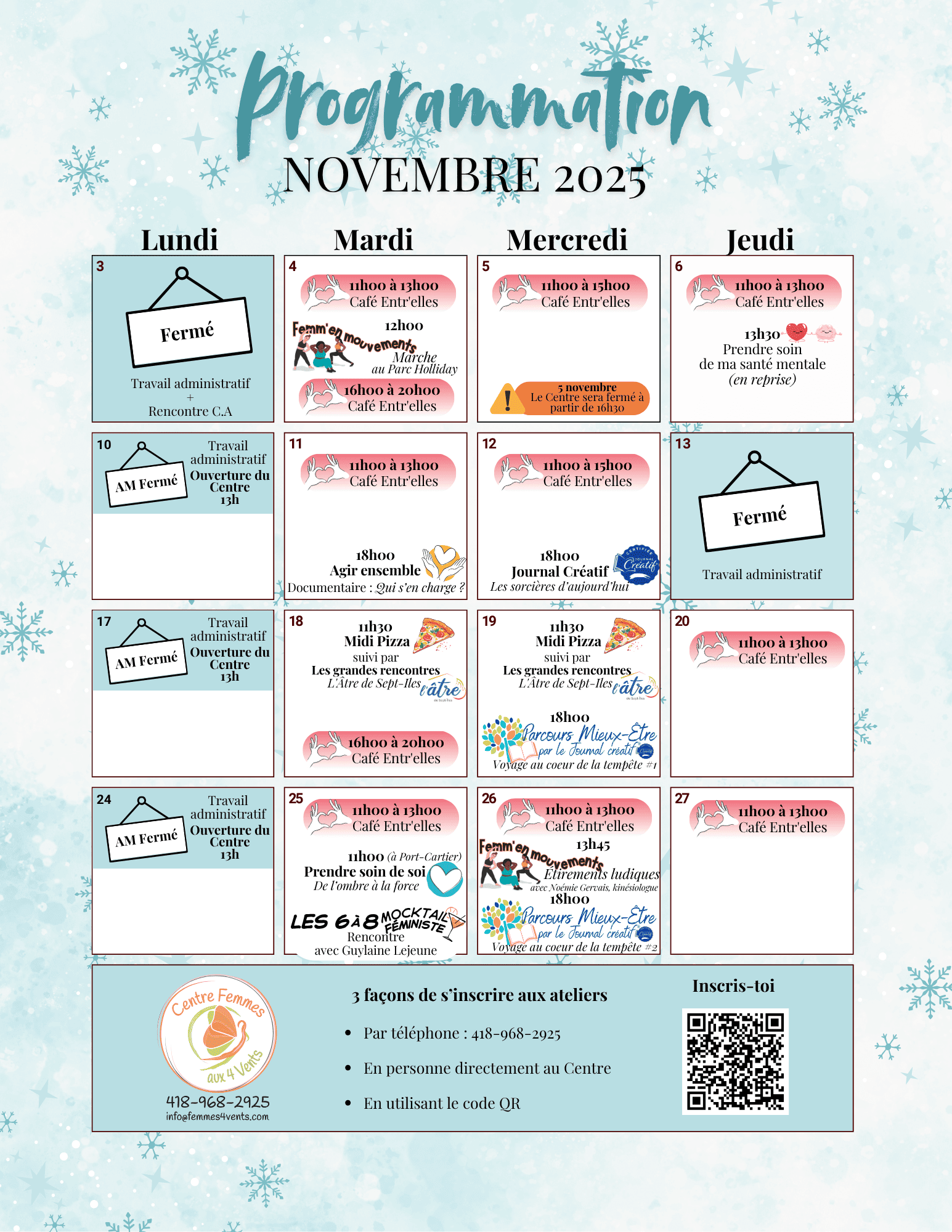 Consulte la programmation mensuelle pour découvrir les heures d’accueil du Café Entr’Elles.